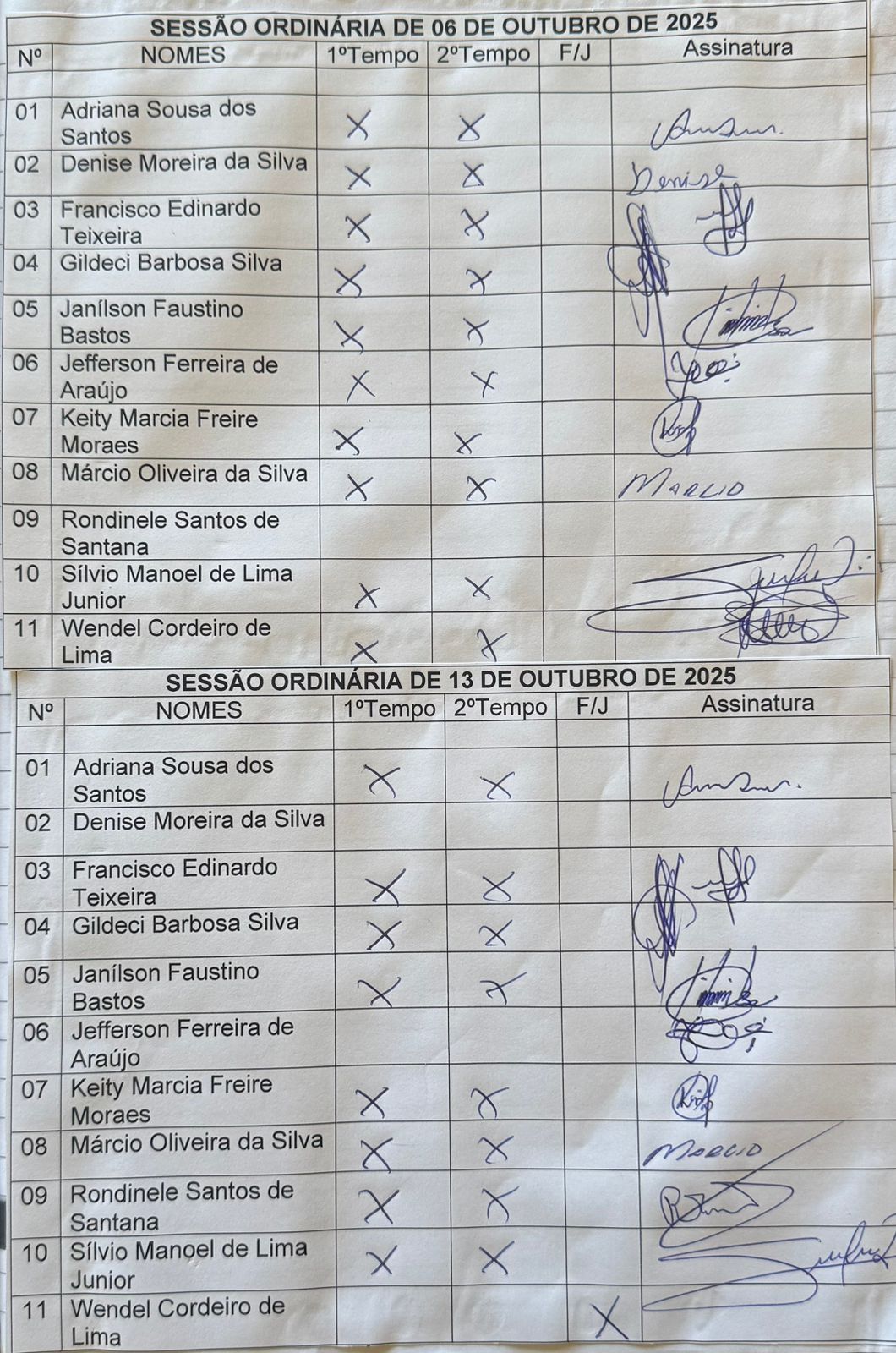 Livro de ponto dos dias 06/10/2025 e 13/10/2025